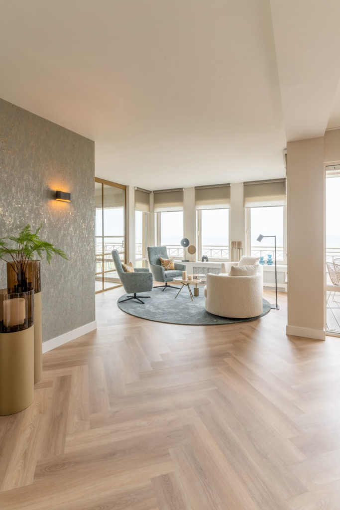 Our apartment has chevron-patterned wood maple flooring. The level of detail and the clean look were really impressive. The floor is quite amazing and seems rich.