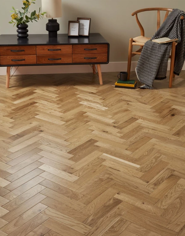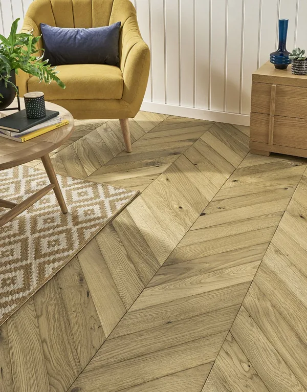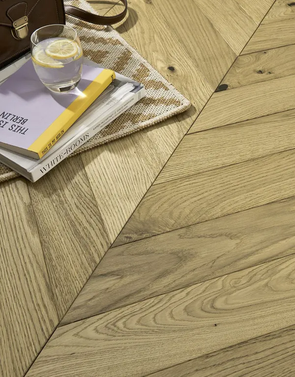 Cambridge Chevron Natural Oak showcases warm brown tones with gentle colour variations, highlighting authentic knots and natural grain for added depth and character. Laid in a striking chevron pattern, this floor creates a refined yet inviting atmosphere. The brushed and oiled finish enhances texture, protects the wood, and delivers a beautifully natural matt appearance.