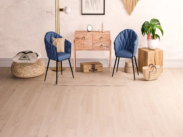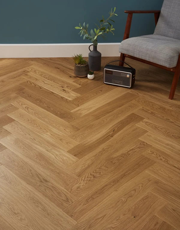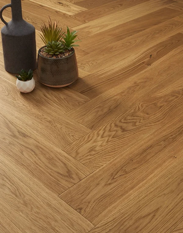Bring timeless elegance to your space with Artisan Herringbone Natural Champagne Oak. Featuring a delicate blend of light and rich tones, this character-grade oak flooring highlights beautiful natural knots and grain variations for a warm, authentic look. The brushed surface enhances texture, while the protective finish ensures durability and easy maintenance—perfect for stylish, high-traffic interiors.