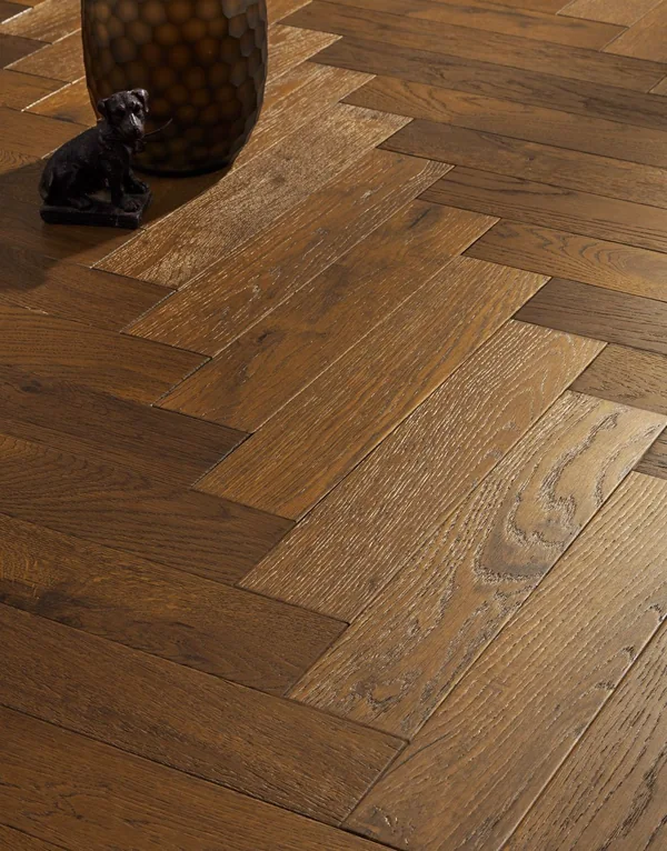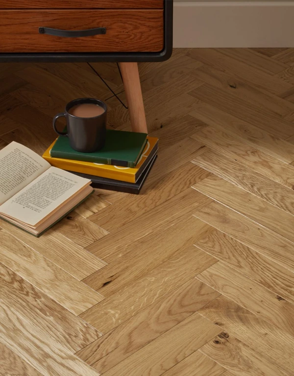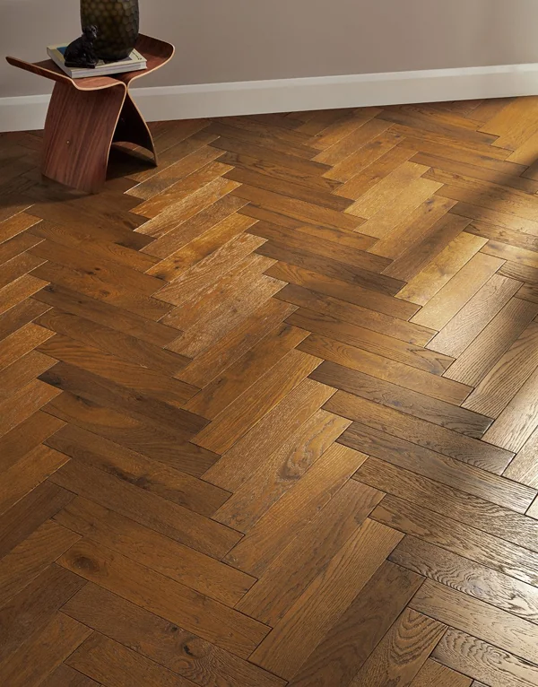 Herringbone Honeycomb Oak showcases a rich blend of bronze, copper, and rust tones, creating a warm and sophisticated statement floor. The striking herringbone pattern enhances its bold character, while natural grain detail adds depth and authenticity. Finished with a brushed and oiled treatment, it offers lasting durability with a beautifully natural matt look.